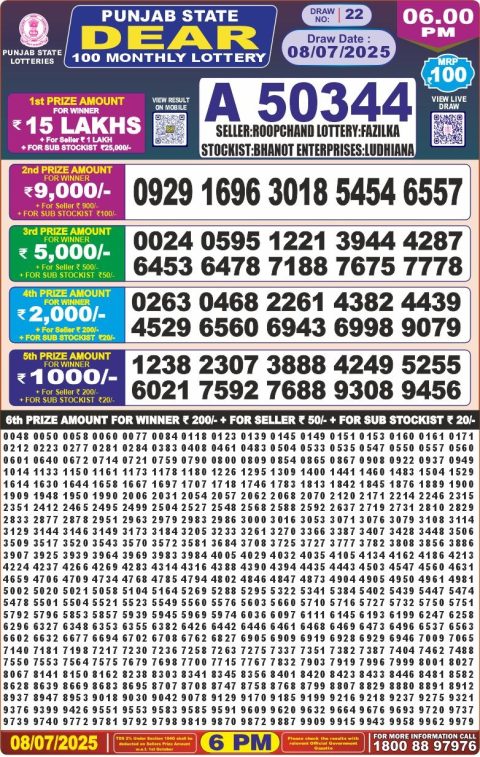 Punjab State Dear 50 Monthly Lottery Result 6pm 08/07/25