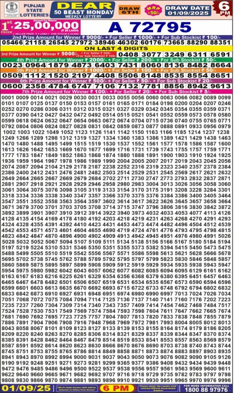 Punjab State Dear 50 Beast Monday Weekly Lottery Result 01/09/25