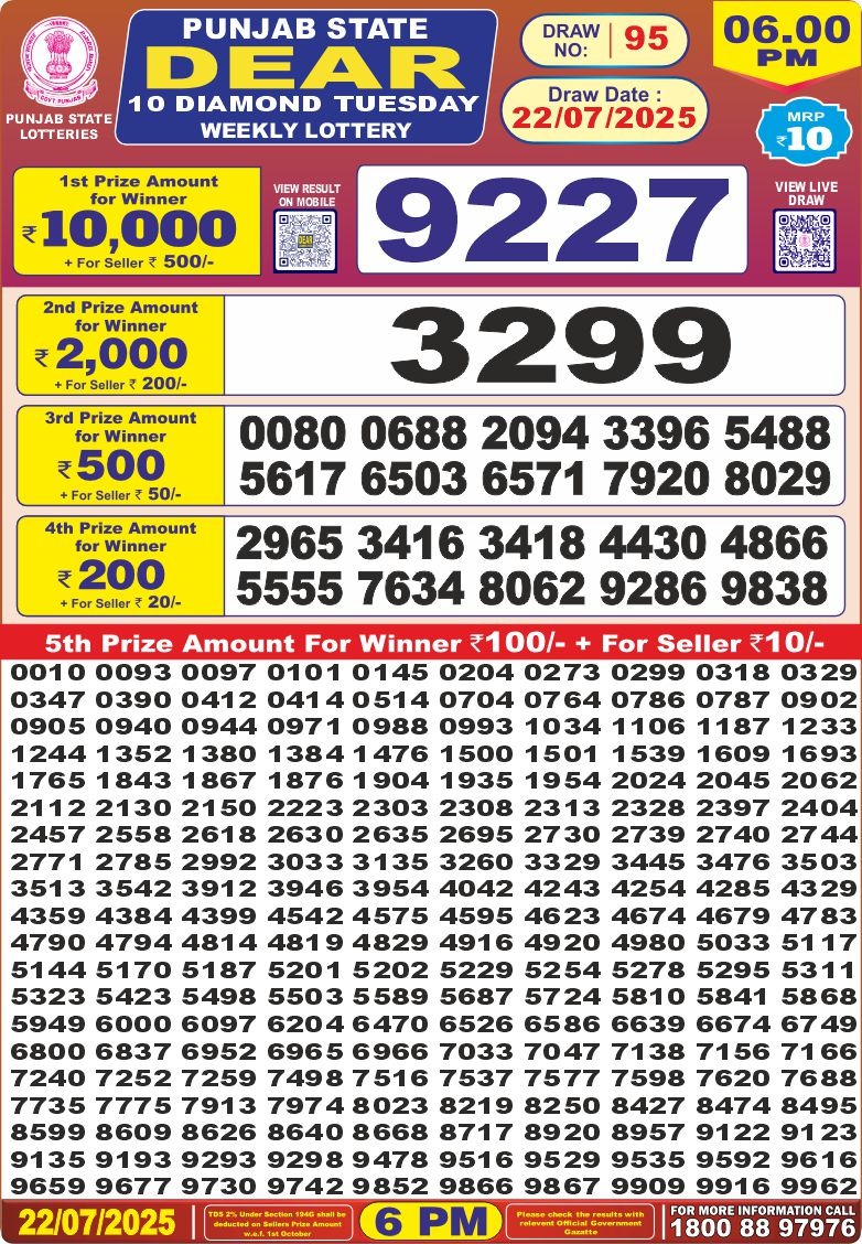 Punjab State Dear 10 Diamond Tuesday Weekly Lottery Result 22/07/25 Leave a Comment on Punjab State Dear 10 Diamond Tuesday Weekly Lottery Result 22/07/25 Share: XFacebookPinterestRedditVKDiggLinkedinMix Related Punjab State Results 0 14 Punjab State Dear 50 Jackal Saturday Weekly Lottery Result 15/11/25 1 40 Punjab State Dear 50 Colt Friday Weekly Lottery Result 14/11/25 0 61 Punjab State Dear 50 Chief Thursday Weekly Lottery Result 13/11/25 2 84 Punjab State Dear 50 Buster Wednesday Weekly Lottery Result 12/11/25