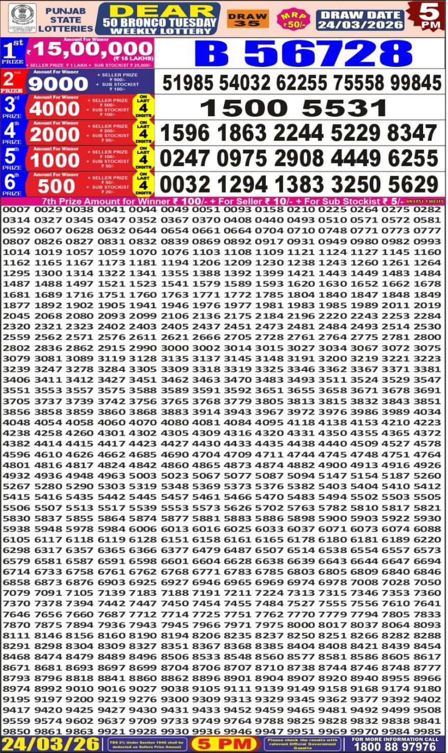 Punjab State Dear 50 Bronco Tuesday Weekly Lottery Result 24/03/26 Leave a Comment on Punjab State Dear 50 Bronco Tuesday Weekly Lottery Result 24/03/26 Share: XFacebookPinterestRedditVKDiggLinkedinMix Related Punjab State Results 0 10 Punjab State Dear 50 Chief Thursday Weekly Lottery Result 02/04/26 0 31 Punjab State Dear 50 Buster Wednesday Weekly Lottery Result 01/04/26 0 55 Punjab State Dear 50 Bronco Tuesday Weekly Lottery Result 31/03/26 0 79 Punjab State Dear 50 Beast Monday Weekly Lottery Result 30/03/26