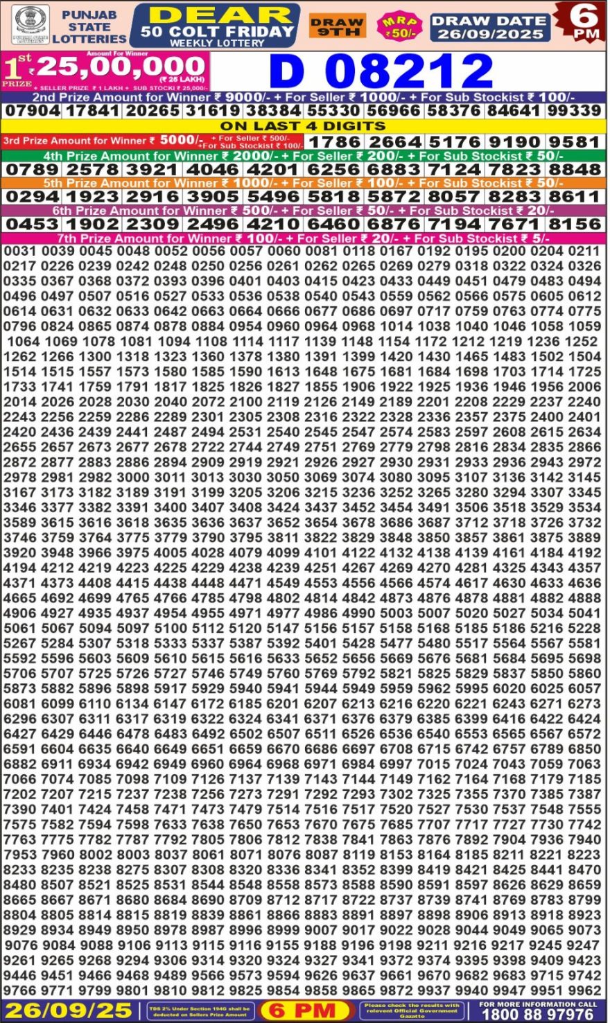 Punjab State Dear 50 Colt Friday Weekly Lottery Result 26/09/25